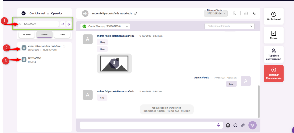 Muestra o gestiona actividades relacionadas con la conversación, como pendientes, recordatorios o acciones asignadas. - Transferir conversación