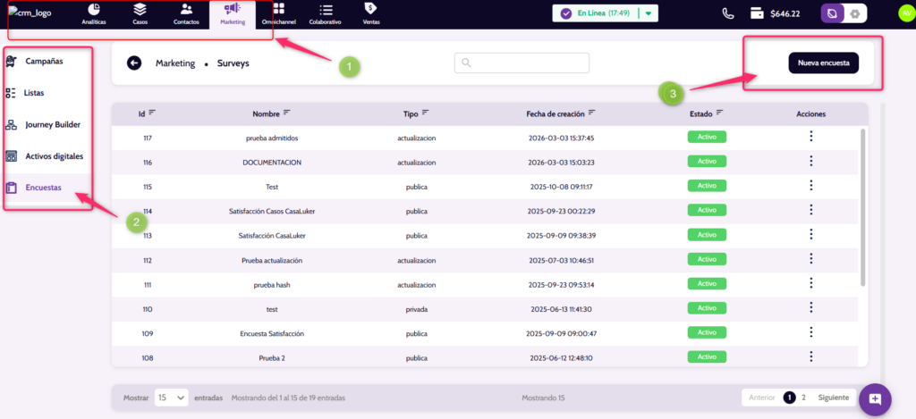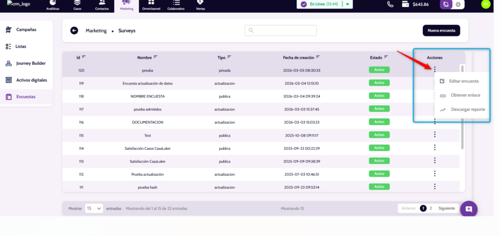 Ingresa al listado de encuestas donde aparece la columna “Estado” con el indicador Activo.